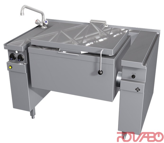 Ideal pan positioning prevents spills and guarantees that the pan is fully emptied. Pan measurements: 700x540 mm, 210 mm deep. 55 mm gap between pan and side columns – for easy cleaning. With electrically driven tilting mechanism with manual switch. Double walled hinged lid and mixer tap as standard. Pan bottom made of special sandwich material as standard. Even heat distribution over the complete bottom of the pan. Thermostatic temperature regulation. Main switch, motor button, end switch, interference button, thermostat, gas solenoid valve, control lamp, spindle motor, mains connection, IpX5. Atmospheric burner, electronic ignition and flame monitor, ignition link. DN 20 (¾") gas connection required. Natural 20; 25 mbar or liquid gas 30; 37; 50 mbar. Heat emission sensitive: 5.5 kW, latent: 5.5 kW. Accessories: 1 Mixer tap with outlet R¾" (DN 20). Optional accessories: Foot pedal switch for the motorised tilting mechanism. Factory installation.