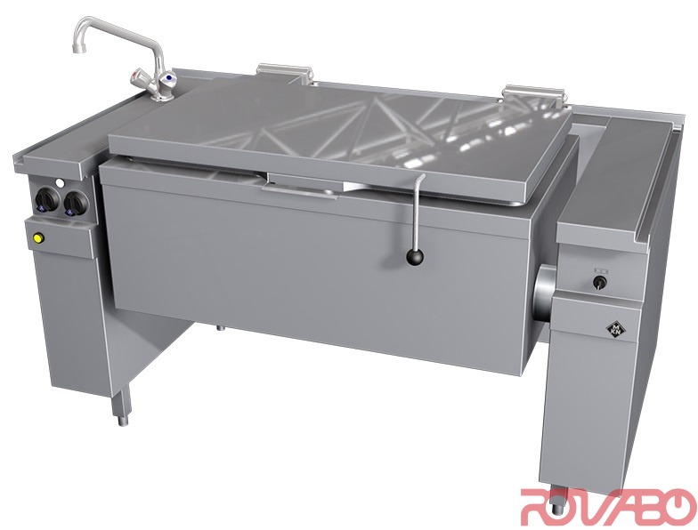 Ideal pan positioning prevents spills and guarantees that the pan is fully emptied. Pan measurements: 1020x540 mm, 210 mm deep. 55 mm gap between pan and side columns – for easy cleaning. With electrically driven tilting mechanism with manual switch. Double walled hinged lid and mixer tap as standard. Pan bottom made of special sandwich material as standard. Even heat distribution over the complete bottom of the pan. Thermostatic temperature regulation. Main switch, motor button, end switch, interference button, thermostat, gas solenoid valve, control lamp, spindle motor, mains connection, IpX5. Atmospheric burner, electronic ignition and flame monitor, ignition link. DN 20 (¾") gas connection required. Natural 20; 25 mbar or liquid gas 30; 37; 50 mbar. Heat emission sensitive: 7.8 kW, latent: 7.7 kW. Accessories: 1 Mixer tap with outlet R¾" (DN 20). Optional accessories: Foot pedal switch for the motorised tilting mechanism. Factory installation.