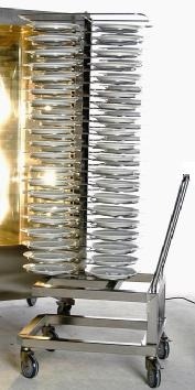 The FlexiCombi FlexiRack® helps you to manage your banquet production without any time pressure. You can double your capacities in the same period of time (compared to working with the MKN combisteamer with GN1/1 format). Plates with a diameter of up to 32 cm can be regenerated. The complete plate banquet system consists of plate rack trolley and thermal cover.