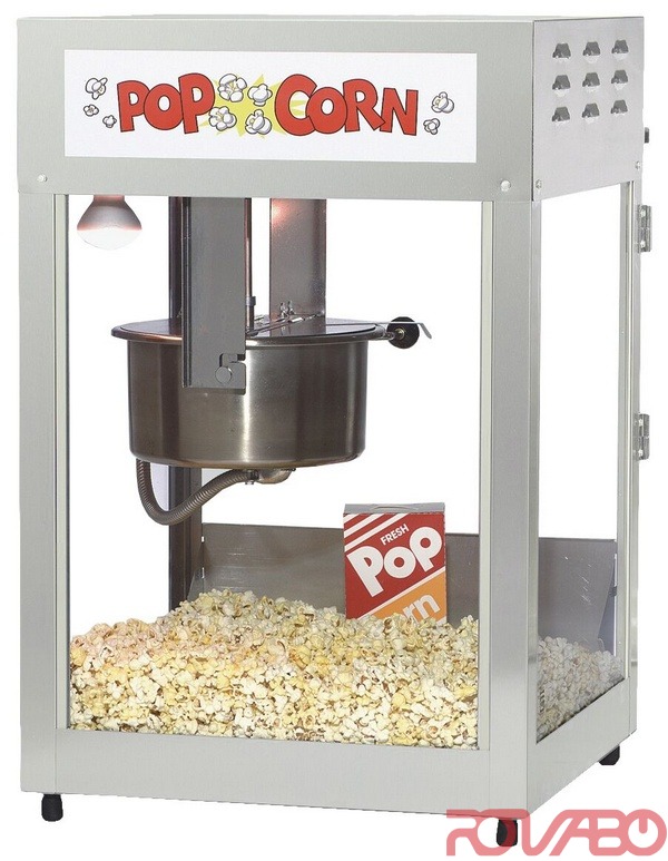 Stainless steel casing, stainless steel kettle. With warming base and lamp. Lift-out glass for easy cleaning. Production: in approx. 3 minutes 340-400 g. per charge (1 standard portion = 1 Oz / 28,35 g) ready made popcorn.