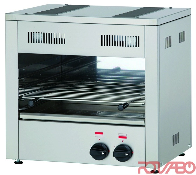 Heavy duty salamander. Infrared burner with maximum surface and efficiency. Gas - butane/propane - 3.30 kW / 2838 Kcal/h, pressure 28/30/50, consumption - 0.24 kg/h. Natural gas - 3.80 kW / 3268 Kcal/h, pressure - 18/20, consumption - 0.32 m3/h.
