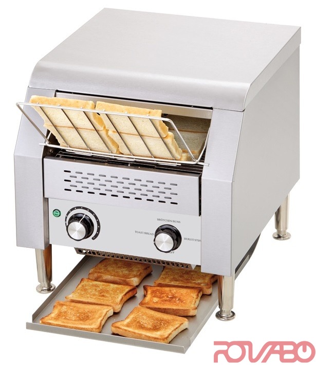 Made of stainless steel. Designed for bread roll, sandwich toast, toast. Output: approx. 150 slices of bread per hour. Heat-up time: 15-20 min. Belt speed (stepless control) and type of heat supply can be controlled separately. Guide opening W265 x H85 mm. ON/OFF switch, ON/OFF control lamp. Electronic control unit, toggle. Functions: Upper/ lower heat (toast); Upper heat (bread roll); Standby.