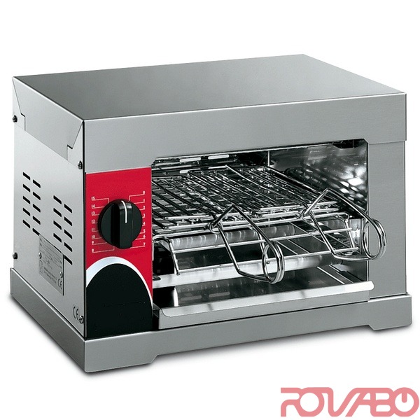 Ideal for heating up pizzas, sandwiches and ready-cooked foods, for cooking hamburgers, würstels and rolls. Stainless steel construction. Easy to clean grills. Removable drip tray. Chromium-plated steel pincers. Elements with quartz tubes or shock-proof coated heating elements available. 15 minutes timer. Optional: selector to switch off the lower heating elements. Toast capacity: 4. Internal dimensions: 235x240 mm.