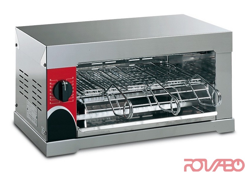 Ideal for heating up pizzas, sandwiches and ready-cooked foods, for cooking hamburgers, wurstels and rolls. Stainless steel construction. Easy to clean grills. Removable drip tray. Chromium-plated steel pincers. 15 minutes timer. Quartz heating elements.