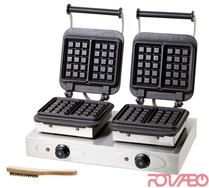 With baking plates “Brussels”. Baking plates are made of cast iron, housing is in stainless steel. The baking plates are firmly mounted. Waffle size: 160 x 100 mm, height 32 mm. 2 separate sockets required. 1 cleaning brush included.