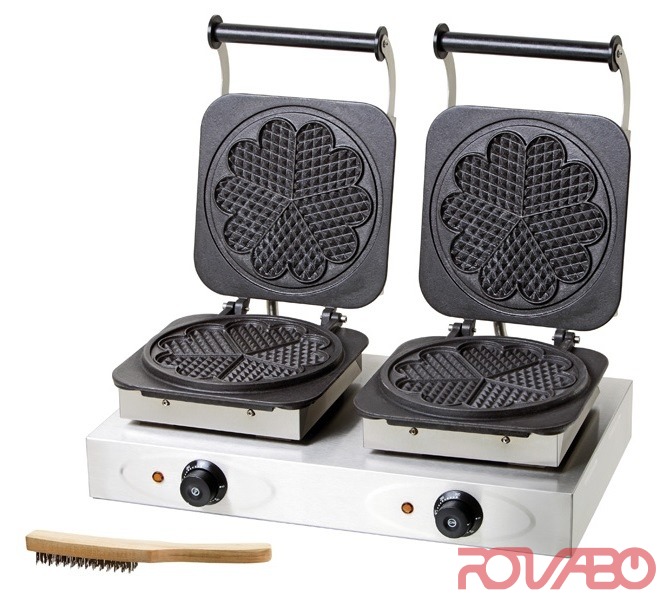 With baking plates heart shaped. Baking plates are made of cast iron, housing is in stainless steel. The baking plates are firmly mounted. Waffle size: Ø 210 mm, height 16 mm. 2 separate sockets required. 1 cleaning brush included.