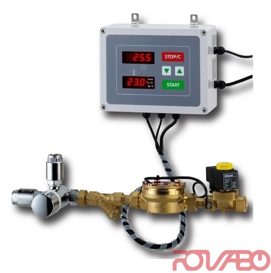 The model is an electronic water doser-mixer with external hydraulics and thermostatically controlled; the temperature is to be set with a knob on the thermostatic mixing valve: this keeps the set temperature even in case of changes in the inlet temperatures. Suitable for artisan bakeries, the model optimizes the water dosing process, ensuring accuracy and repeatability of quantity and temperature with error margins lower than 1% on the dosing and 1.5 °C on the temperature. The last settings are always kept in memory.