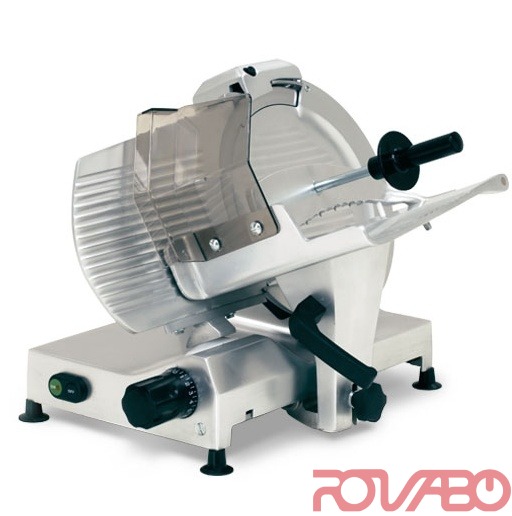 Made of aluminium alloy treated with anodic oxidation. Poly V belt drive. Built-in sharpener. Carriage on double rectified bar. For retail and collective catering. Controls with N.V.R. device. Carriage stroke 290 mm. Thickness adjustment: 0-15 mm. Blade Ø 300 mm. Slicing capacity: 160 mm for round products, 170x230 mm for rectangular products. Meat hopper removable by means of a relevant knob (no tool required).