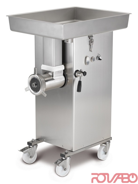 Larger barrel and tube feeder, 50% to 80% extra capacity as compared. Excellent mincing performance, thanks to a special design and the very small tolerance between worm and barrel. Easy to fit, sturdy head fixing. Casing and feed pan in AISI 304 stainless steel. Easy and safe to clean; the head, the feed pan, the tube and the mincing group can be removed to be thoroughly washed, without any risk of damaging the machine. Forced ventilated motor, for continuous use. Start, emergency stop and reserve push-button commands are fitted with low tension (24V) NVR. Electrical parts are contained in an IP 56 rated water-tight box. Unger S5 cutting system: 3 plates, 2 knives and 2 rings made of stainless steel. Output: 750 kg/h. On request: semi-automatic hamburger mouldin, foot control and specials voltages, 60 Hz.