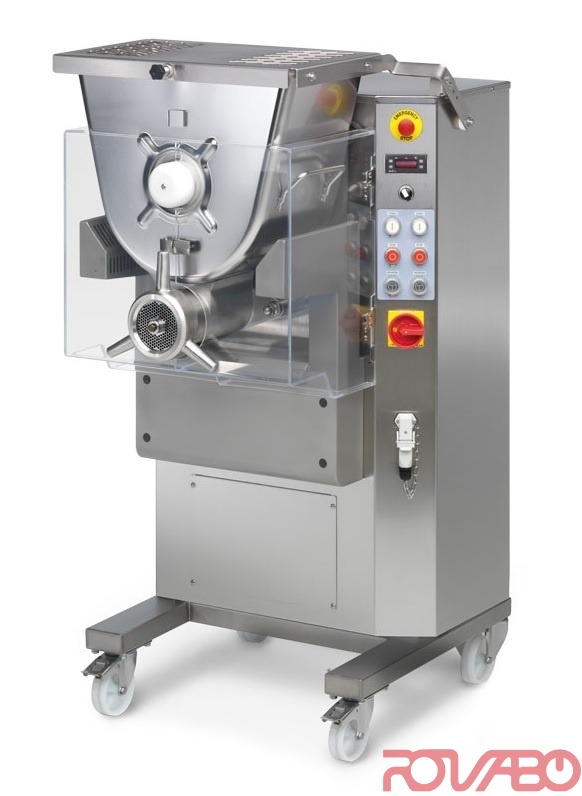 32/98 external head for mass production in AISI 304 stainless steel, easily disassembling: Enterprise: 1 plate and one self-sharpening knife in stainless steel. Casing, mincing assembly, blades and pan in AISI 304 stainless steel. Two independent motors with reverse. Silent and maintenance-free reduction gear drive. Mincing unit, pan and cover safeguarded by safety microswitches. Window, head and pan cooled by air circulation. Output: 800 kg/h. Power mixer: 600 W. Pan capacity: 42 l.
