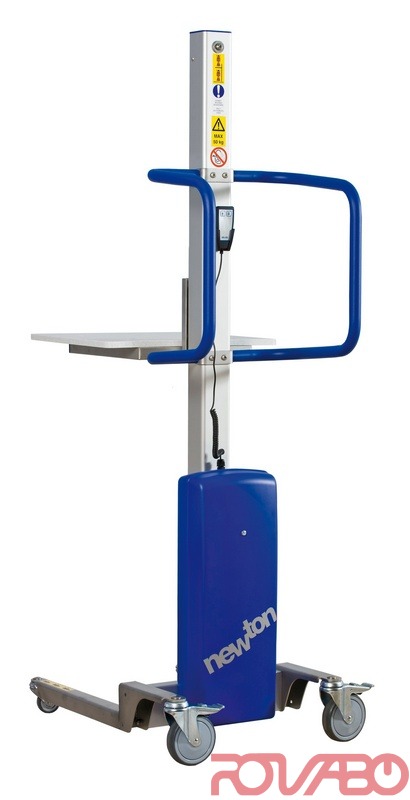 Min/maks., pakelimo aukštis 110/1450 mm. Pakelimo greitis, 120 mm/sek. Vidiniai/išoriniai ratukai Ø50/120 mm. Krovinio svoris - 50 kg. Labiausiai saugus ir patogus būdas dirbti. Jokių kabelių, kelimo prietaisas veikia su baterijomis. Nuo 90 iki 120 maksimalios apkrovos pakrovimo ir iškrovimo ciklų. Baterijų pakrovimo laikas 8 valandos, kaip įprasta naktį, prieš naują darbo dieną. Pakrovimo įtampa 100 - 240 V. Baterija 2x7,5 A/val., 12 V. Komplekte: platforma 485x460 mm. Pagaminta iš nerūdijančio plieno ir poliamido.