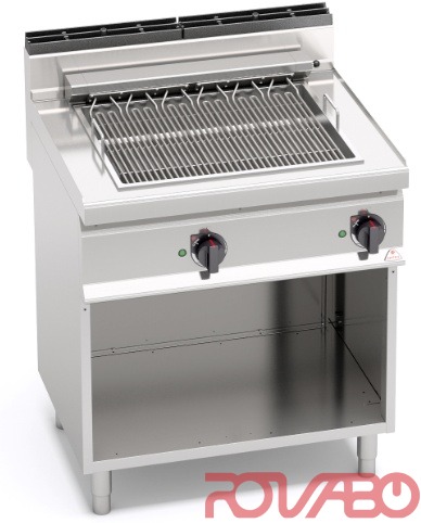 Darbo paviršius iš nerūdijančio plieno AISI 304, kurio storis 20/10. Priekinės ir šoninės plokštės - iš AISI 304 su Scotch Brite apdaila. Dvi kepimo zonos su dviem galios reguliatoriais, maksimali temperatūra - 400°C. Indikatorinės lemputės. Didelio galingumo kaitinimo elementai. Valymo programa naudojant pirolizės technologiją, kai vos per kelias minutes maisto likučiai paverčiami pelenais. Lengvai išardomi komponentai, kad būtų lengviau atlikti techninės priežiūros ir valymo darbus. Išimamas nerūdijančio plieno dėklas vandeniui laikyti ir kepimo riebalams surinkti. Priedai: grandiklis, ketaus grotelės.