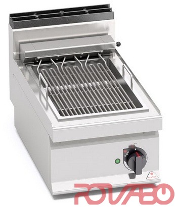 Worktop from AISI 304 stainless steel with 20/10 thickness. Fits power regulator, max temperature 400 °C. Signalization lights. High power armored heating elements for cooking food in direct contact. Cleaning program using pyrolysis technology that, in a few minutes, causes the thermal decomposition of cooking residuals. Rotating resistances and easily removable components for facilitating standard maintenance and cleaning operations. Removable stainless steel tray for collecting cooking fat and containing water.