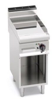 Darbo ir priekiniai paviršiai iš nerūdijančio plieno AISI 304. Darbo paviršius lygus, su apsauga nuo purslų, iš dviejų komponentų, kuriuose sujungta plieninė plokštė su viršutine AISI 316 poliruoto nerūdijančio plieno danga, kad būtų lengvesnis valymas ir žemas radiacijos lygis. Incoloy plieno kaitinimo elementai, rankinis termostato valdymas, kontrolinė lemputė ir temperatūros indikatorius. Temperatūros reguliavimas nuo 50°C iki 270°C. Šiek tiek pasviręs kepimo paviršius su anga skysčių nutekėjimui. Ypač tinka švelniam gaminimui. Su atvira spintele. Reguliuojamos kojelės.