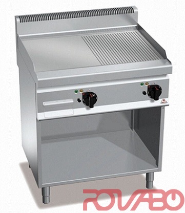 Darbo ir priekiniai paviršiai iš nerūdijančio plieno AISI 304. Dvi kepimo zonos - viena lygi, kita rifliuota, su apsauga nuo purslų ir atskirais valdikliais nepriklausomam ir optimaliam temperatūros reguliavimui. Incoloy plieno kaitinimo elementai, rankinis termostato valdymas, kontrolinė lemputė ir temperatūros indikatorius. Temperatūros reguliavimas nuo 50°C iki 270°C. Šiek tiek pasviręs kepimo paviršius su anga skysčių nutekėjimui. Reguliuojamos kojelės. Su atvira spintele.