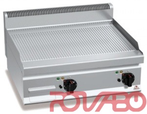 Darbo ir priekiniai paviršiai iš nerūdijančio plieno AISI 304. Darbo paviršius rifliuotas, su apsauga nuo purslų. Dvi zonos su atskirais valdikliais nepriklausomam ir optimaliam temperatūros reguliavimui. Incoloy plieno kaitinimo elementai, rankinis termostato valdymas, kontrolinė lemputė ir temperatūros indikatorius. Temperatūros reguliavimas nuo 50°C iki 270°C. Šiek tiek pasviręs kepimo paviršius su anga skysčių nutekėjimui. Statoma ant stalo.