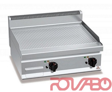Darbo ir priekiniai paviršiai iš nerūdijančio plieno AISI 304. Darbo paviršius rifliuotas, su apsauga nuo purslų. Dvi zonos su atskirais valdikliais nepriklausomam ir optimaliam temperatūros reguliavimui. Incoloy plieno kaitinimo elementai, rankinis termostato valdymas, kontrolinė lemputė ir temperatūros indikatorius. Temperatūros reguliavimas nuo 50°C iki 270°C. Šiek tiek pasviręs kepimo paviršius su anga skysčių nutekėjimui. Reguliuojamos kojelės. Su atvira spintele.