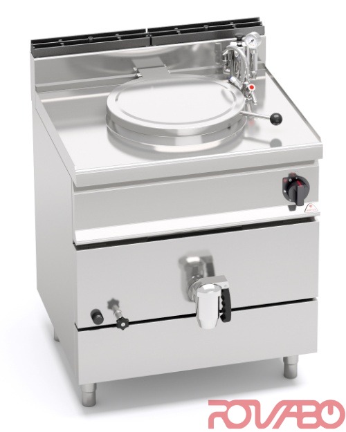 Darbo ir priekiniai paviršiai iš nerūdijančio plieno AISI 304. Nerūdijančio plieno AISI 304 virimo talpa, kurios storis 15/10. Dugnas iš nerūdijančio plieno AISI 316, 20/10 storio. Vamzdiniai degikliai pagaminti iš nerūdijančio plieno, su optimizuotu degimu, apsauginiu termoporos vožtuvu ir apsaugota liepsna. Pjezoelektrinis uždegimas su silikonine apsauga. 1 1/2 colio vandens išleidimo čiaupas iš chromuoto žalvario, su atermine rankena. Netiesioginis kaitinimas su viduje generuojamu žemo slėgio garu (0,5 baro). Šalto ir karšto vandens čiaupai talpos užpildymui ir plovimui. Mechaninis vandens lygio matuoklis. Temperatūros reguliavimas nuo minimalaus iki maksimalaus lygio. Reguliuojamos kojelės.