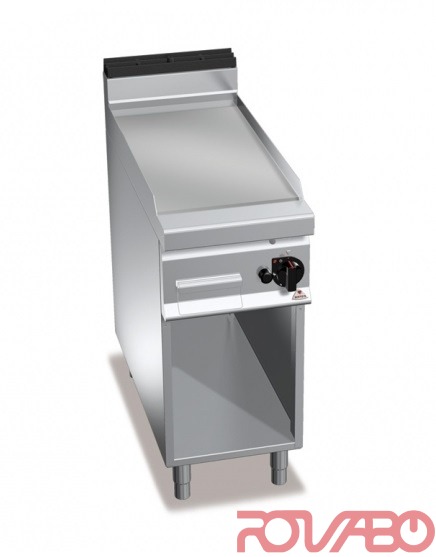 Našumas - 110 mėsainių Ø100/val. Lygus kepimo paviršius iš maksimaliai tvirto arba šlifuoto plieno. Vienoda temperatūros paskirstymo sistema aprūpina optimalų gaminimą be šilumos praradimo, tuo pačiu taupo elektros energiją. Maisto likučiai nukreipiami į specialų kanalą, kur surenkami dideliame rezervuare į kurį papuola per didelę likučių surinkimo angą. Vamzdeliniai degikliai su stabilia liepsna. Budinti liepsna ir apsauginis vožtuvas su termopora. Elektrinis pjezo uždegėjas. Galima naudoti ir suskystintas dujas: G30/G31, G20, G25.