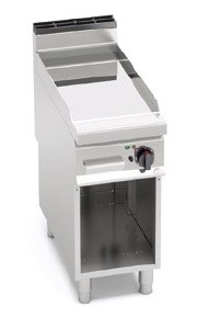 Kepimo paviršius iš chromuoto plieno. Su viena lygia kepimo zona. Tai leidžia gaminti įvairių rūšių patiekalus, tame tarpe ir delikatesinius. Vienoda temperatūros paskirstymo sistema aprūpina optimalų gaminimą, tuo pačiu taupo elektros energiją. Maisto likučiai nukreipiami į specialų kanalą, kur surenkami dideliame rezervuare, į kurį papuola per didelę likučių surinkimo angą. Būvio ir temperatūros lemputė. Su atvira spintele.