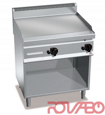 Kepimo paviršius iš labai tvirto arba šlifuoto plieno. Su dviem lygiom kepimo zonom. Vienoda temperatūros paskirstymo sistema aprūpina optimalų gaminimą, taupo elektros energiją. Maisto likučiai nukreipiami į specialų kanalą, kur surenkami dideliame rezervuare, į kurį papuola per didelę likučių surinkimo angą. Būvio ir temperatūros lemputė. Su atvira spintele.
