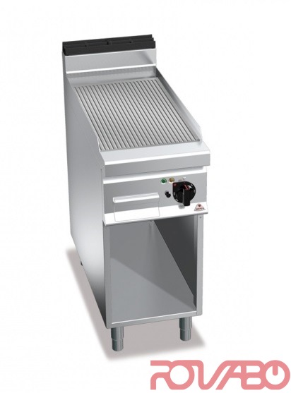 Našumas - 110 mėsainių Ø100/val. Rifliuotas kepimo paviršius iš maksimaliai tvirto arba šlifuoto plieno. Vienoda temperatūros paskirstymo sistema aprūpina optimalų gaminimą be šilumos praradimo, tuo pačiu taupo elektros energiją. Maisto likučiai nukreipiami į specialų kanalą, kur surenkami dideliame rezervuare į kurį papuola per didelę likučių surinkimo angą. Vamzdeliniai degikliai su stabilia liepsna. Budinti liepsna ir apsauginis vožtuvas su termopora. Elektrinis pjezo uždegėjas. Galima naudoti ir suskystintas dujas: G30/G31, G20, G25.