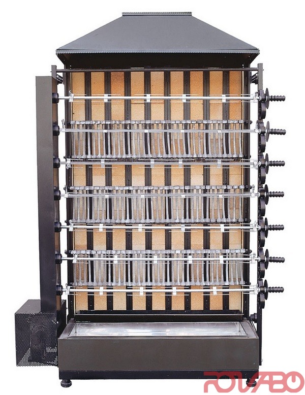 Įrengimas pagamintas iš aukštos kokybės medžiagų, tai garantuoja efektyvų įrengimo naudojimą ilgus metus. Kepama su medžio anglimi. 7 iešmų. Vištų talpa - 42 vnt. Padėklas riebalų nuvarvėjimui. Variklis su grandinine pavara ir plieniniais grandininiais ratukais. Nuimami iešmai. Specialus karščiui atsparus akmuo.