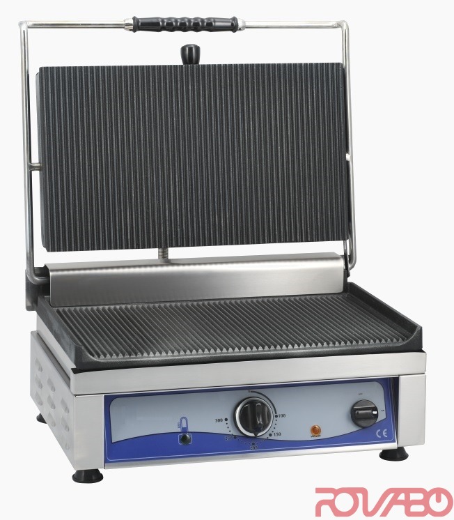 Stainless steel body. Fry top and bottom are made of cast iron. Top and bottom grooved. Grill surface 450x270 mm. Temperature control light (green). Operation control light (red). Fat collection tray.