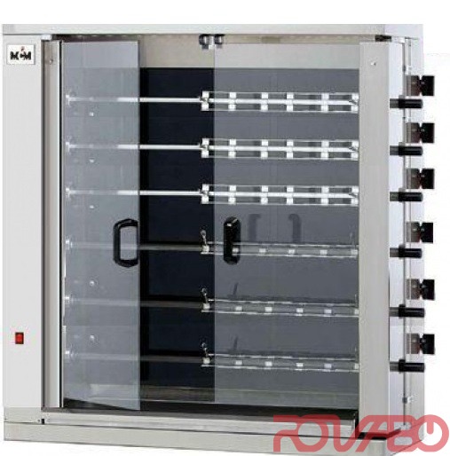 New range of electric vertical grills with vitroceramic burners for a better diffusion of heat and easy cleaning. Made from stainless steel. Doors with tempered glass. 11 spits. Capacity 66 chickens.