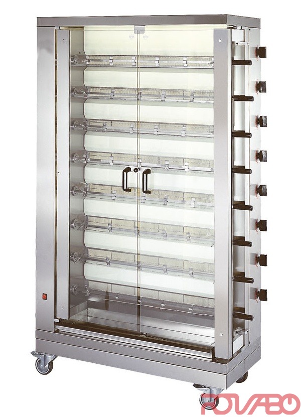 Made from stainless steel. Doors with tempered glass. Tray 870х295х50 mm, for juices, for roasting potatoes and vegetables. The plates between the burners removable for easy cleaning. Wheel stand included. Diameter of wheels: 10 cm. 8 spits. Capacity 48 chickens.