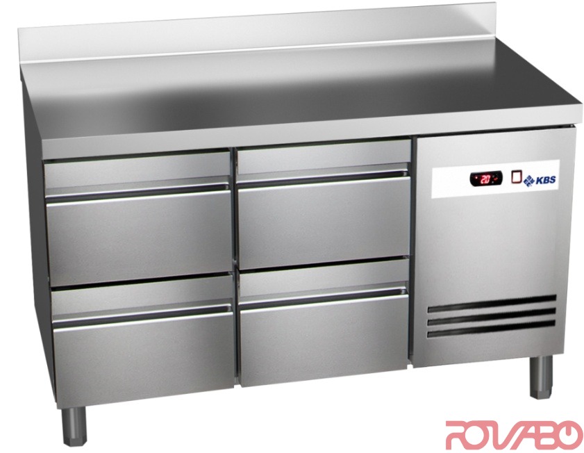 Made of stainless steel. Back side made of sheet steel. Electronic control and automatic defrost. 60 mm PUR insulation / 40 kg/m3. Top plate all-side 50 mm folded. Hollow section door seal, exchangeable without tools. Vertical, integrated handle bar. Self-closing door. Basin-shaped bottom. 4 drawers. With splashback.
